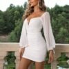 Womens Formal Bodycon Mini Party Dresses Long Sleeve Ruched Corset Ball Gown Sequin Cocktail Gala Dress for Women White